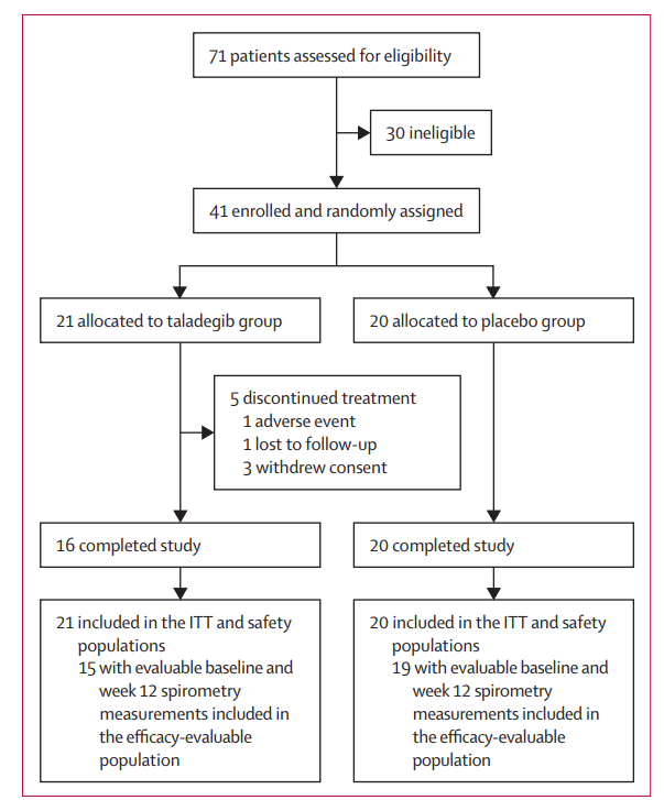 本试验招募了年龄超过40岁、确诊IPF且未接受任何同步抗纤维化治疗的患者。患者随机分配接受每日一次200mg口服Taladegib或安慰剂,治疗12周,随访6周。主要终点为安全性,次要终点为基线至第12周的肺活量(FVC)变化,探索性终点包括高分辨率CT上纤维化相关参数变化。 定期评估包括体征、实验室指标、不良事件及肺功能测定。肺功能采用中心化肺量测定法,HRCT采用标准化协议并由中心读片保证一致性。研究严格遵守国际临床试验规范,所有患者均签署知情同意。