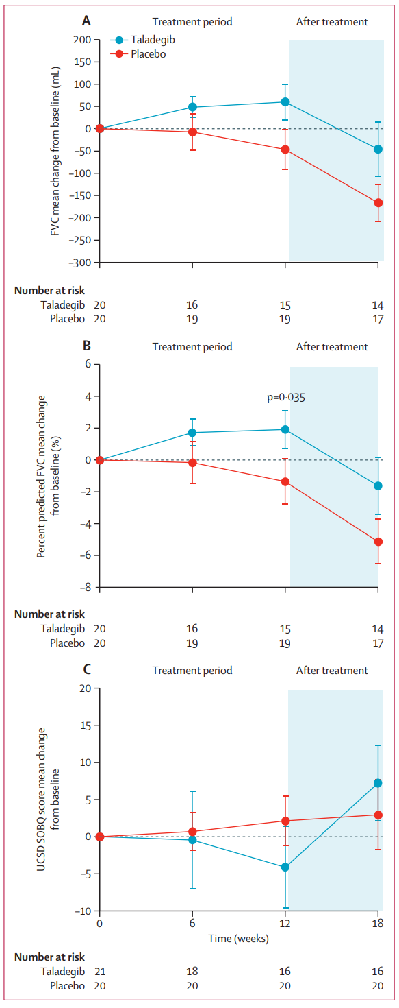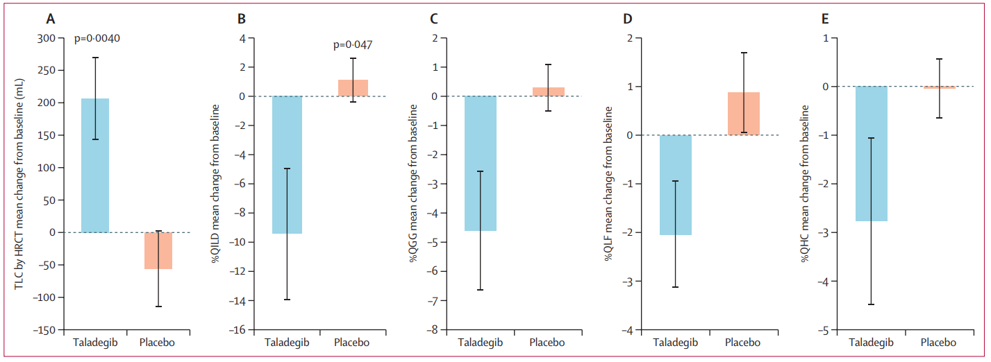 肺功能方面,Taladegib组在12周时的预测肺活量百分比(% FVC)较安慰剂组显著改善(组间差异3.95%,p=0.035),且从第6周开始呈现改善趋势,治疗停止后肺功能下降速度与安慰剂相似。 影像学方面,Taladegib组总肺容量(TLC)和定量间质性肺疾病百分比(%QILD)显著改善(TLC组间差异257 mL,p=0.004;%QILD组间差异p=0.047),提示纤维化程度减轻。 无患者死亡,安全性及耐受性良好。