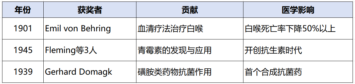 20世纪上半叶,人类面临的最大健康威胁来自传染病。诺贝尔生理学或医学奖在这一时期的颁奖重点,集中体现了人类从被动应对到主动防御的医学突破。1901年,德国科学家Emil von Behring因"发现血清疗法及其在治疗白喉中的应用"成为首位获奖者,这种通过注射免疫血清对抗病原体的方法,使白喉死亡率大幅下降,开创了被动免疫治疗的先河。