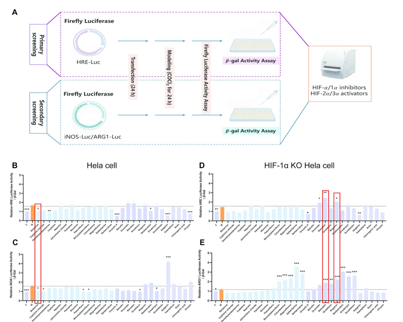 研究人员基于HIF-1α抑制和HIF-2α激活的双靶点策略,设计双荧光素酶报告基因系统筛选活性成分。采用Loewe模型确定最佳协同配比。在体外,利用棕榈酸(PA)和脂多糖(LPS)激活的RAW264.7巨噬细胞模型评估抗炎效果;体内采用高脂饮食诱导的肥胖小鼠模型,通过空腹血糖、口服葡萄糖耐量试验和胰岛素耐量试验评价胰岛素敏感性。组织学结合免疫组化、qRT-PCR和ELISA检测脂质代谢及炎症指标变化。