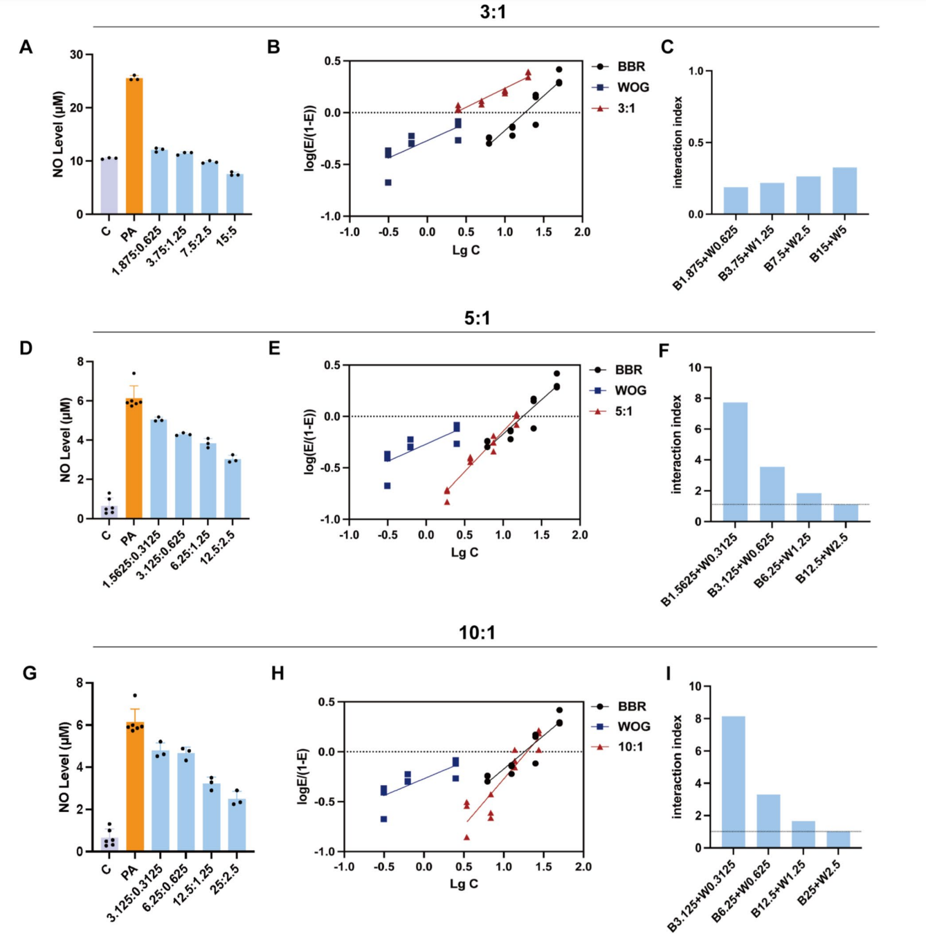 图:BBR与WOG在三种配比下的协同抗炎作用