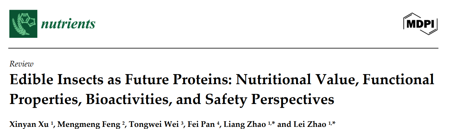 Xu, X.; Feng, M.; Wei, T.; Pan, F.; Zhao, L.; Zhao, L. Edible Insects as Future Proteins: Nutritional Value, Functional Properties, Bioactivities, and Safety Perspectives. Nutrients 2025, 17, 3165. https://doi.org/10.3390/nu17193165
