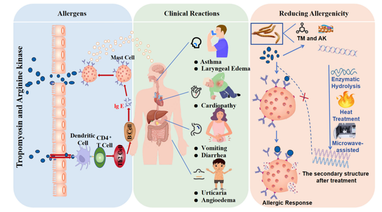 昆虫蛋白的过敏问题是目前亟需解决的安全瓶颈。临床及体外研究表明,昆虫蛋白与甲壳类动物存在交叉过敏反应,主要过敏原包括肌动蛋白和精氨酸激酶。昆虫蛋白在烹饪和消化过程中部分保持稳定的过敏位点,现有的酶解、热处理及微波辅助水解技术虽可降低过敏原活性,但尚无法完全消除。未来需结合先进组学技术鉴定新型过敏原,开发针对性的免疫脱敏策略,并开展临床验证确保消费者安全。