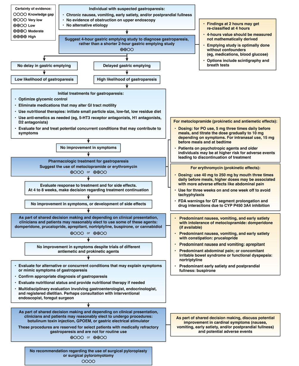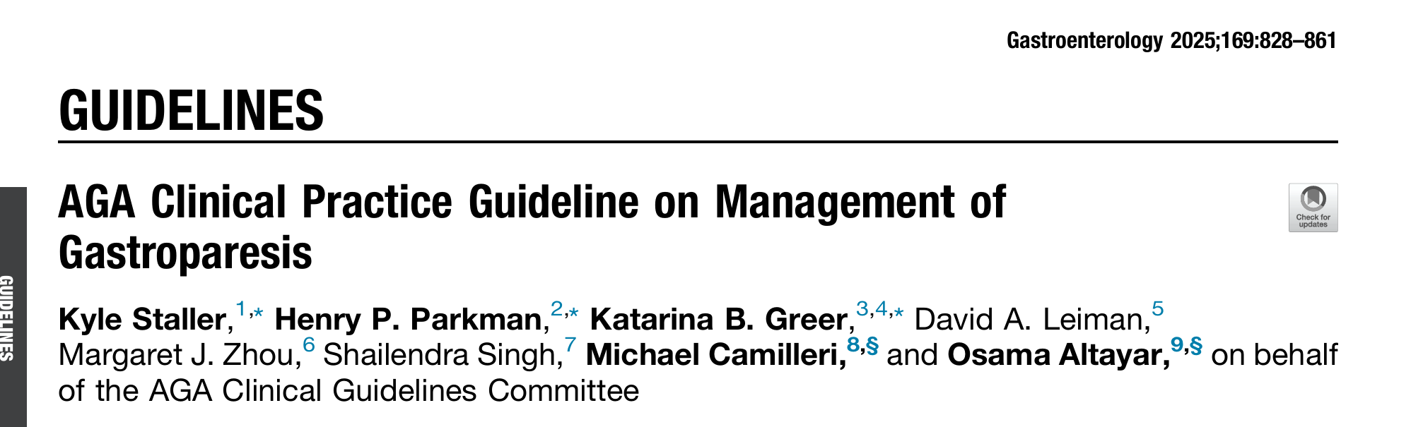 Staller, K., Parkman, H. P., Greer, K. B., Leiman, D. A., Zhou, M. J., Singh, S., Camilleri, M., & Altayar, O. (2025). AGA Clinical Practice Guideline on Management of Gastroparesis. Gastroenterology, 169(5), 829-861. https://doi.org/10.1053/j.gastro.2025.08.004