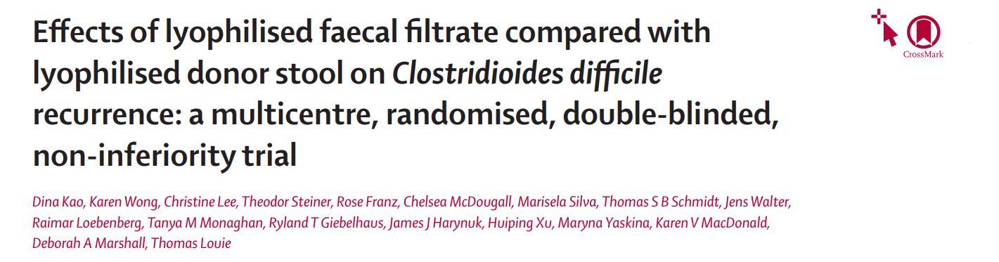 Kao D, Wong K, Lee C, et al. Effects of lyophilised faecal filtrate compared with lyophilised donor stool on Clostridioides difficile recurrence: a multicentre, randomised, double-blinded, non-inferiority trial. Lancet Gastroenterol Hepatol. 2025;10(11):986-997. doi:10.1016/S2468-1253(25)00190-6