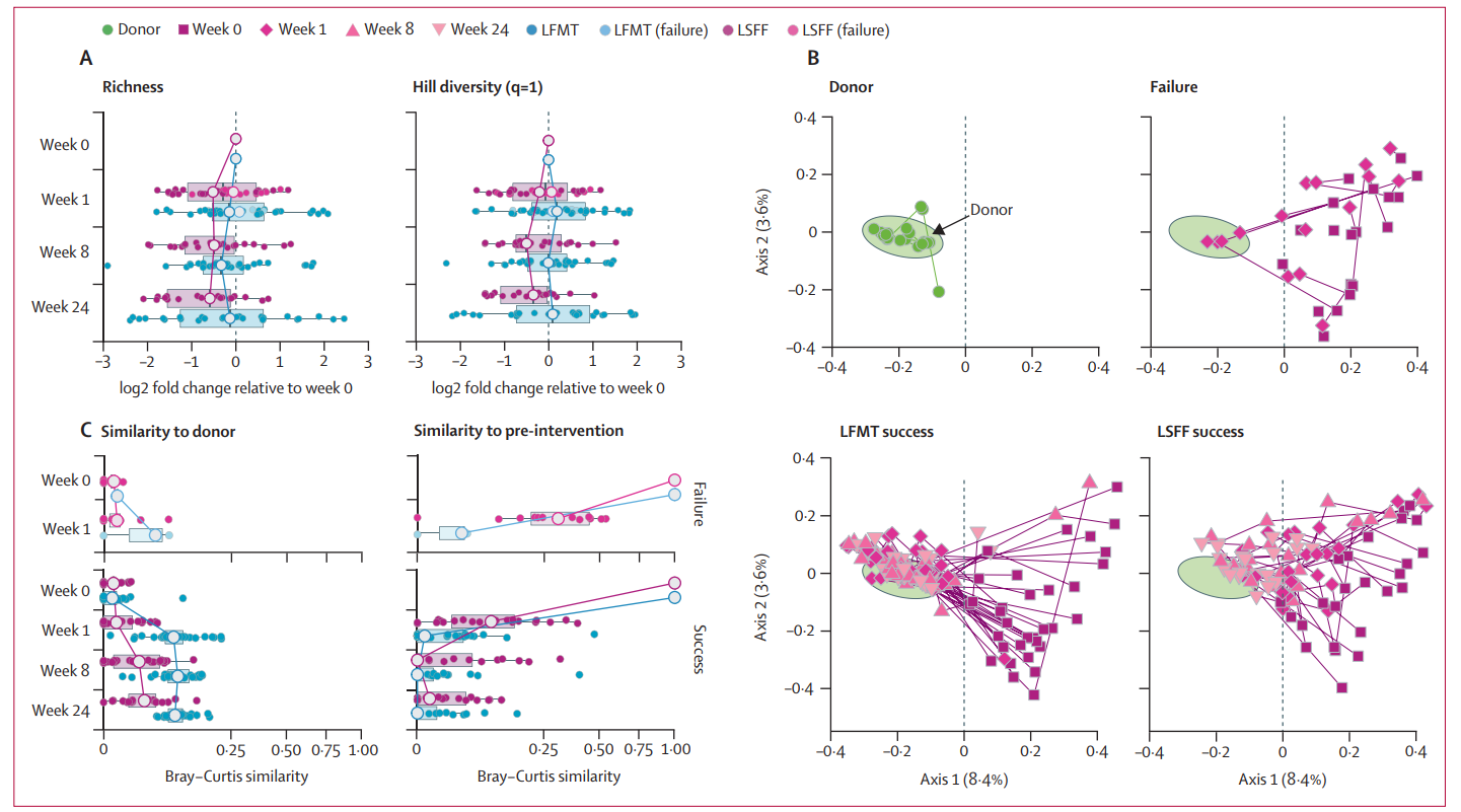 研究人员纳入标准为年龄≥18岁,且至少经历两次CDI复发的患者。参与者随机分配(1:1)接受口服LSFF或LFMT治疗,治疗剂量均为15粒胶囊,外观一致。主要终点为治疗后8周内无CDI复发(定义为连续两天以上每日超过三次Bristol便形6或7型)。采用治疗依从性人群(per-protocol population)进行主要疗效分析。设定非劣效性界值为-10%。 治疗前,患者接受至少10天的口服万古霉素或菲达昔霉素治疗至症状缓解,随后停药24小时后进行FMT。患者随访1、4、8及24周,期间监测复发情况及不良事件。肠道微生物组通过16S rRNA测序分析,代谢组学采用基于单一供体样本的二维气相色谱-飞行时间质谱(GC×GC-TOFMS)进行评估。