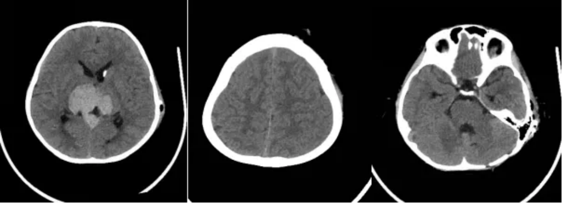 2023年10月7日患者无诱因出现恶心、呕吐、精神差,肢体乏力,无视物模糊、视物缺损等症状入院,并于10月12日和16日进行MR和CT检查(图3-4),结果提示:肿瘤复发并梗阻性脑积水。