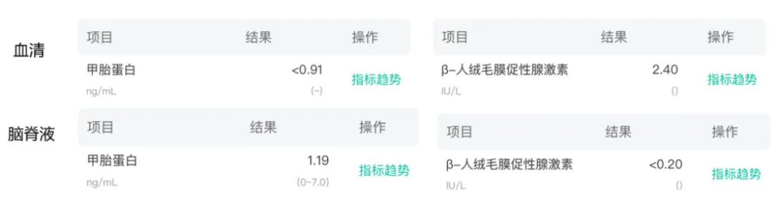 术后第一天(10月17日),患者体格检查显示,昏迷—嗜睡,双侧瞳孔D=3.0mm,光反应(+),CT检查结果提示脑积水缓解(图5)。术后血清和脑脊液肿瘤标志物检测(图6)、脑脊液细胞学检查和全脊髓MRI检查均为阴性。临床诊断为松果体区复发生殖细胞瘤,梗阻性脑积水。