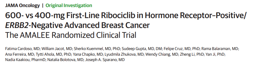 Cardoso F, Jacot W, Kuemmel S, et al. 600- vs 400-mg First-Line Ribociclib in Hormone Receptor–Positive/ERBB2-Negative Advanced Breast Cancer: The AMALEE Randomized Clinical Trial. JAMA Oncol. Published online September 25, 2025. doi:10.1001/jamaoncol.2025.3687