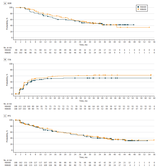 图:瑞波西利400毫克(RIB400)与瑞波西利600毫克(RIB600)组间DOR、TTR及PFS的Kaplan-Meier曲线图