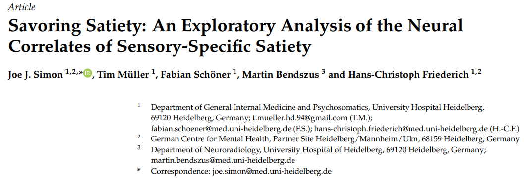 Simon, J.J.; Müller, T.; Schöner, F.; Bendszus, M.; Friederich, H.-C. Savoring Satiety: An Exploratory Analysis of the Neural Correlates of Sensory-Specific Satiety. Nutrients 2025, 17, 3229. https://doi.org/10.3390/nu17203229