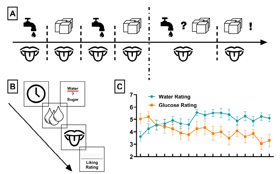 (A)味觉刺激任务示意图,包含实验期间呈现的刺激物。任务第一阶段,参与者被动接受水或葡萄糖的输注。任务第二阶段,参与者可在水或葡萄糖之间进行选择,但会间歇性接受葡萄糖的被动输注。(B)味觉刺激任务的单次试次结构。每个试次均以提示信号开始,该提示信号要么指示即将输注的液体类型(水龙头符号代表水,方糖符号代表葡萄糖),要么在任务第二阶段指示参与者可在水与葡萄糖输注之间进行选择。随后进行液体输注(以水滴符号指示),接着指示参与者‘品尝’液体(以口 - 舌符号指示)。每个试次结束时,要求参与者对相应液体的喜爱程度进行评分。(C)水与葡萄糖的喜爱度评分随时间的变化。水的评分随时间显著升高,而葡萄糖的评分随时间显著降低(均采用线性回归分析;p 值均 < 0.005)。