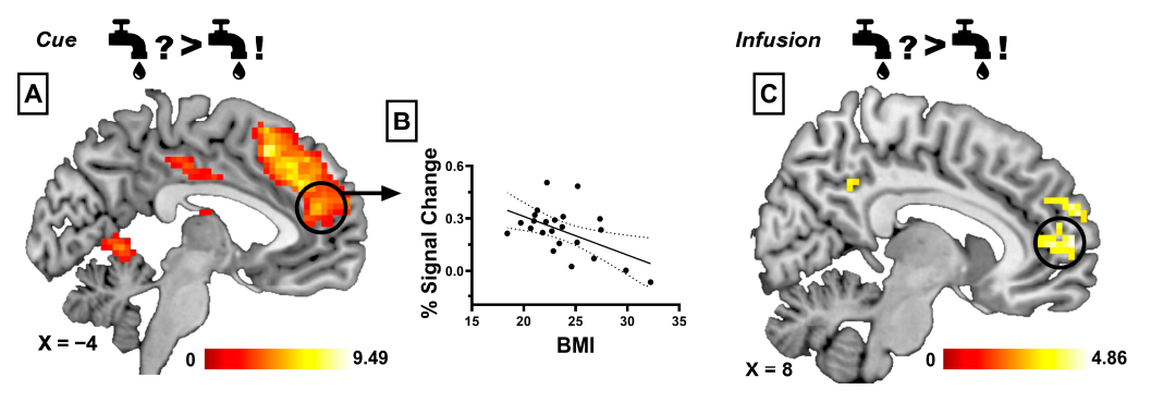 (A)与盐水剥夺(SSS)前预期水味觉时相比,盐水剥夺期间预期水味觉时,内侧前额叶皮质(黑色圆圈标记处)激活增强。(B)从内侧前额叶皮质提取的信号变化百分比与个体体重指数(BMI)呈负相关(相关系数 r = −0.527,p = 0.009)。(C)与葡萄糖特异性盐水剥夺前品尝水时相比,葡萄糖特异性盐水剥夺期间品尝水时,内侧前额叶皮质(黑色圆圈标记处)激活增强。彩色团块代表经簇水平家族误差校正后具有显著性的激活区域,叠加于标准 MNI 模板上以实现可视化呈现。