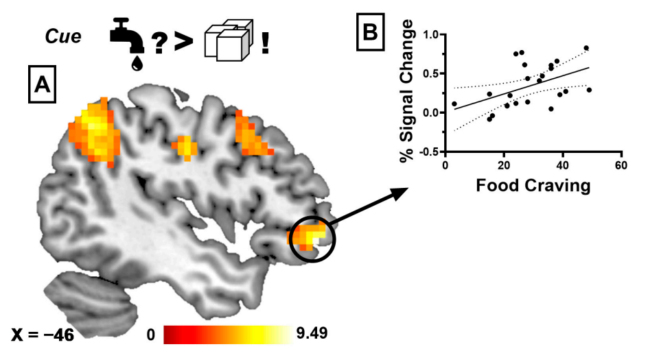 (A)盐水剥夺(SSS)期间,预期水味觉时的左侧外侧眶额皮质激活(黑色圆圈标记处),相较于盐水剥夺期间预期葡萄糖味觉时显著增强。(B)从左侧外侧眶额皮质提取的信号变化百分比,与状态依赖性食物渴求评分呈正相关(相关系数 r = 0.474,p = 0.022)。彩色团块代表经簇水平家族误差校正后具有显著性的激活区域,叠加于标准 MNI 模板上以实现可视化呈现。