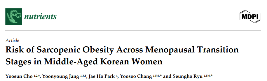 Cho, Y.; Jang, Y.; Park, J.H.; Chang, Y.; Ryu, S. Risk of Sarcopenic Obesity Across Menopausal Transition Stages in Middle-Aged Korean Women. Nutrients 2025, 17, 3238. https://doi.org/10.3390/nu17203238