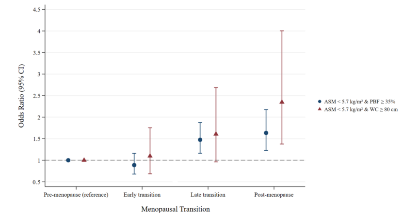 结果显示,基线时平均年龄42.2岁,平均BMI为22.1 kg/m²,15.6%参与者肌肉量低,16.1%体脂超标。年龄增长与肌少性肥胖风险显著相关(OR=1.07,95%CI:1.04-1.10)。相比绝经前,晚期过渡(OR=1.48,95%CI:1.16-1.87)和绝经后阶段(OR=1.63,95%CI:1.23-2.17)肌少性肥胖风险显著增加,且与年龄及其他混杂因素无关。