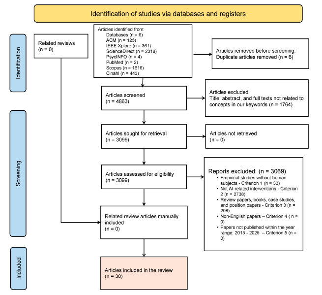 本综述严格遵循PRISMA 2020指南,检索了七大数据库(包括ACM、IEEE Xplore、ScienceDirect、PsycINFO、CINAHL、PubMed和Scopus)中2015年至2025年间发表的相关文献。纳入标准为:涉及60岁及以上老年人群的AI营养干预的实证研究,涵盖定性、定量及混合方法研究。通过双重独立评价确保文献筛选的科学性和一致性,数据提取涵盖研究设计、AI技术类型、干预内容、评估指标及伦理考量。采用定量统计和定性内容分析相结合的方法,对干预效果、技术应用趋势及存在问题进行全面分析。