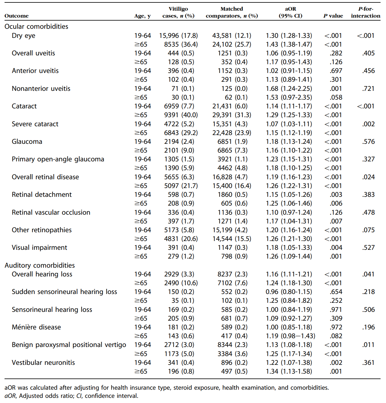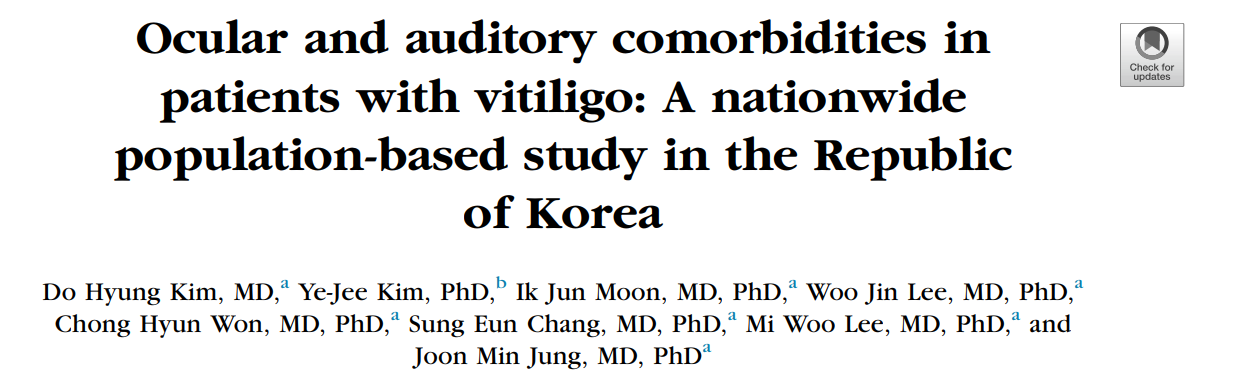 Kim DH, Kim YJ, Moon IJ, et al. Ocular and auditory comorbidities in patients with vitiligo: A nationwide population-based study in the Republic of Korea. J Am Acad Dermatol. 2025;93(4):956-965. doi:10.1016/j.jaad.2025.06.047