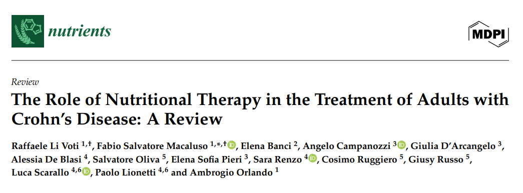 Li Voti, R.; Macaluso, F.S.; Banci, E.; Campanozzi, A.; D’Arcangelo, G.; De Blasi, A.; Oliva, S.; Pieri, E.S.; Renzo, S.; Ruggiero, C.; et al. The Role of Nutritional Therapy in the Treatment of Adults with Crohn’s Disease: A Review. Nutrients 2025, 17, 3186. https://doi.org/10.3390/nu17203186