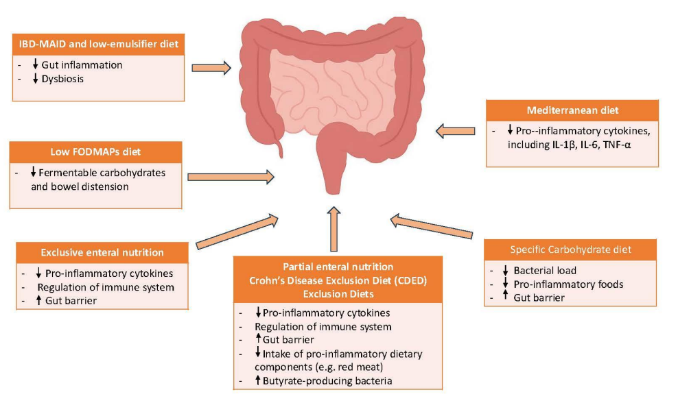 • 特定碳水化合物饮食(SCD):虽在儿科显示症状改善,成人数据有限且缺乏一致的内镜证据,饮食限制严格,依从性差,未被广泛推荐。