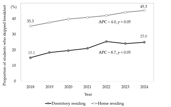Lee, J.M.; Shim, J.-S. Breakfast Skipping Among Dormitory- and Home-Residing High School Students: Insights from the Korea Youth Risk Behavior Survey 2018–2024. Nutrients 2025, 17, 3190. https://doi.org/10.3390/nu17203190
