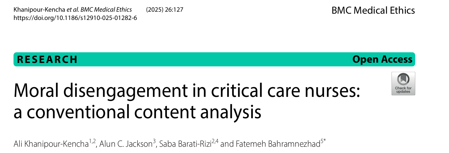 Khanipour-Kencha, A., Jackson, A. C., Barati-Rizi, S., & Bahramnezhad, F. (2025). Moral disengagement in critical care nurses: a conventional content analysis. BMC Medical Ethics, 26, 127. https://doi.org/10.1186/s12910-025-01282-6