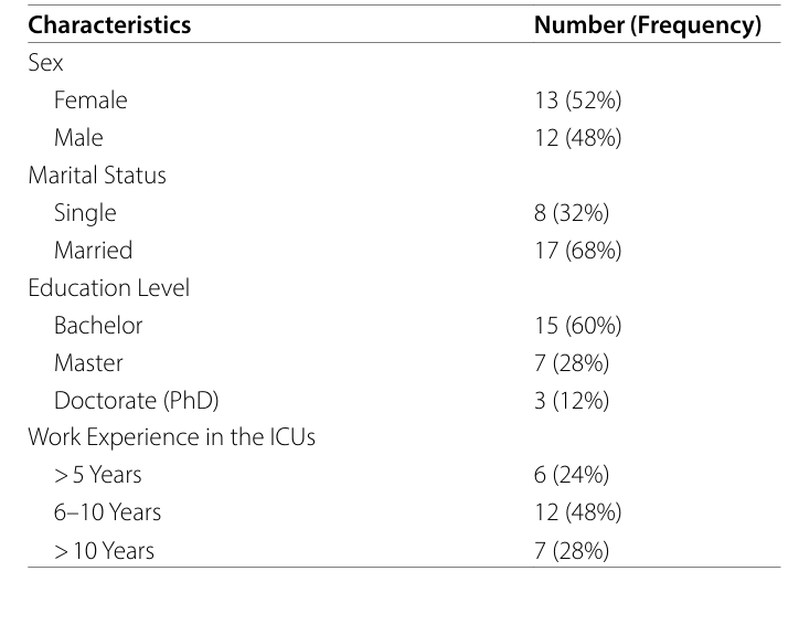 接着根据代码的相似性与差异性进行分类,并提取子类别;最后多次比较子类别以创建类别。当数据收集持续产生先前数据或类别的重复,表明未获得新信息时,即停止抽样。在分析阶段,研究明确区分了实际伦理失范与在竞争性道德原则下做出的伦理上可接受的决策。例如因资源限制优先处理某患者需求可能属伦理可接受,而忽视患者基本护理需求则代表伦理失败。研究结果基于对25名ICU护士进行的30次访谈,其中三名参与者接受了一次以上访谈。参与者平均年龄为38.40岁,人口统计详细信息见表1。从数据中提取出765个初始代码,通过持续比较及分析代码间的相似性、差异性与内容邻近性,识别出三个主要类别,涵盖八个子类别。这一过程有助于厘清数据中的概念与内部关系,最终形成结构化分类,详情见表2。