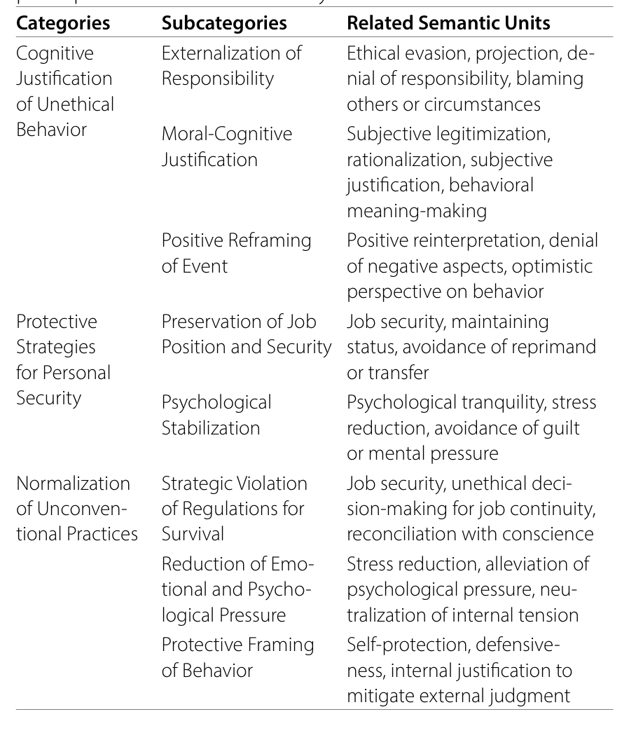 第一个类别为不道德行为的认知合理化,涵盖三个子类别:责任外化、道德认知合理化及事件积极重构。参与者表示在从事可能具有专业或伦理疑问的行为后,会使用特定认知过程使该行为在心理上显得合法、正当且可接受。这些认知过程主要表现为三种形式:责任外化指个体否认自身在行为中的角色,将责任归因于工作条件、组织政策或他人行动等外部因素。例如有参与者提到若某行为错误则医生为何亲自执行,并强调并非其决定而是情势所迫;或指出若有适当管理则情况可能不同,主张低效责任不在自身。道德认知合理化指个体试图通过某种认知机制从道德或专业角度为其行为辩护,从而赋予其意义。例如有参与者认为不接听患者家属电话并非错误,而是保持对患者更专注的专业决策,显示其行为虽违背普遍规范,却被视为具有专业与伦理支持。事件积极重构则是一种认知策略,个体以积极方式重新解释事件或行为,重构其价值以减少负面感受,从而帮助自己远离因行动产生的内疚或焦虑。例如有资深护士指出此类行为仅为自然反应或必须接受的事实。由此可见,护士诉诸认知合理化过程以应对因行为违背专业规范而产生的心理压力。这些过程包括责任外化、道德认知合理化及事件积极重构。此类认知机制帮助护士在行动与护理伦理原则冲突时,远离内疚感同时维持专业表现。