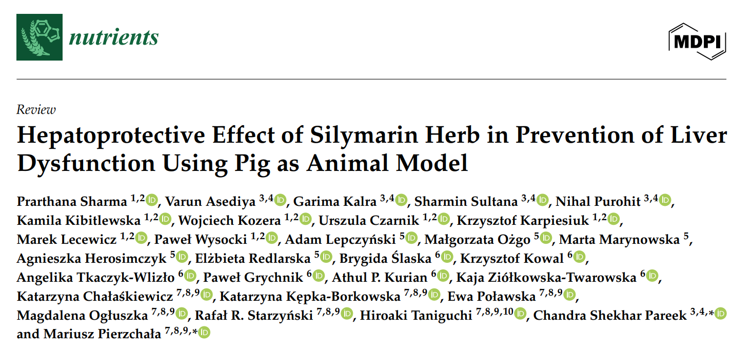Sharma, P.; Asediya, V.; Kalra, G.; Sultana, S.; Purohit, N.; Kibitlewska, K.; Kozera, W.; Czarnik, U.; Karpiesiuk, K.; Lecewicz, M.; et al. Hepatoprotective Effect of Silymarin Herb in Prevention of Liver Dysfunction Using Pig as Animal Model. Nutrients 2025, 17, 3278. https://doi.org/10.3390/nu17203278