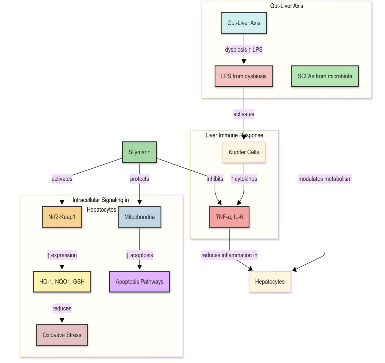 肠道菌群与肝脏轴:水飞蓟素的肝脏保护效应还通过调节肠道菌群结构及其代谢物产生发挥作用,促进有益菌群生长,减少内毒素漏入肝脏,减轻系统性炎症反应。