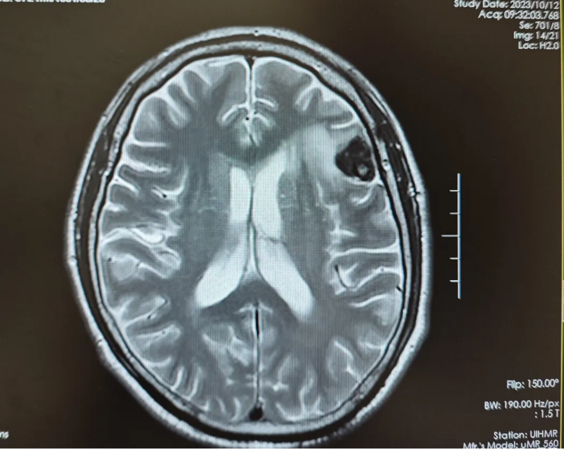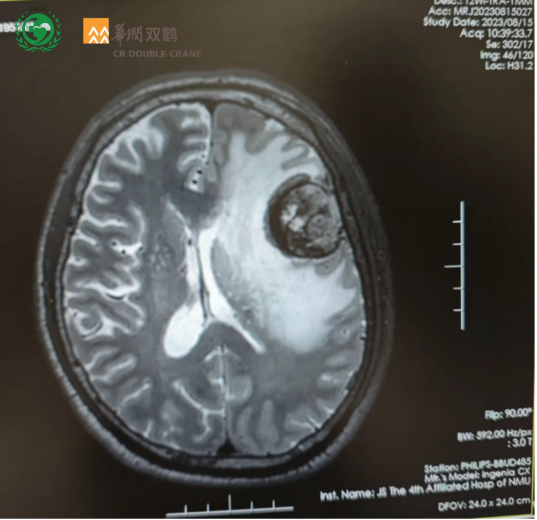 2023-08-15复查磁共振平扫+增强提示:左侧额叶占位性病变,大小约3.8cm*3.2cm *3.5cm团块状异常信号影,结合病史,考虑脑转移瘤;脑内多发缺血腔梗灶;老年性脑改变(图1)。