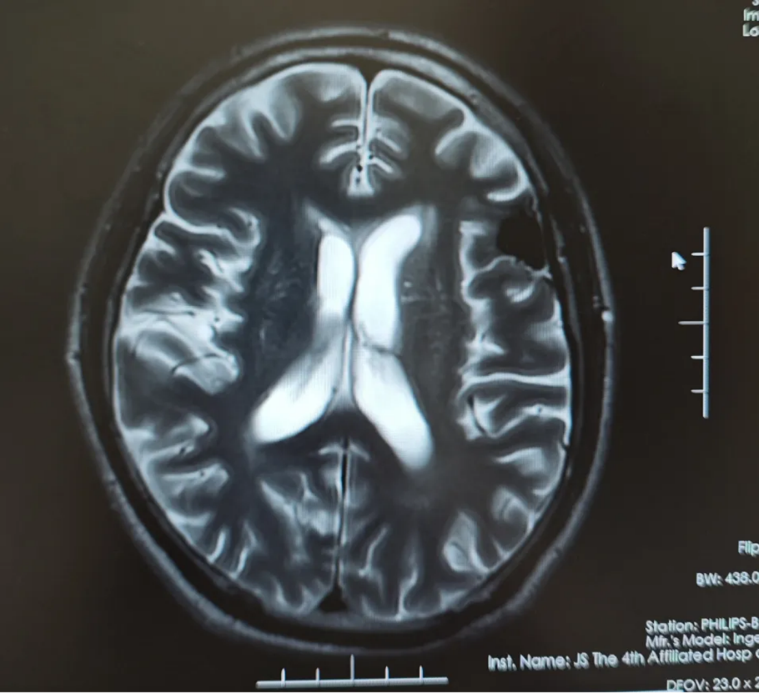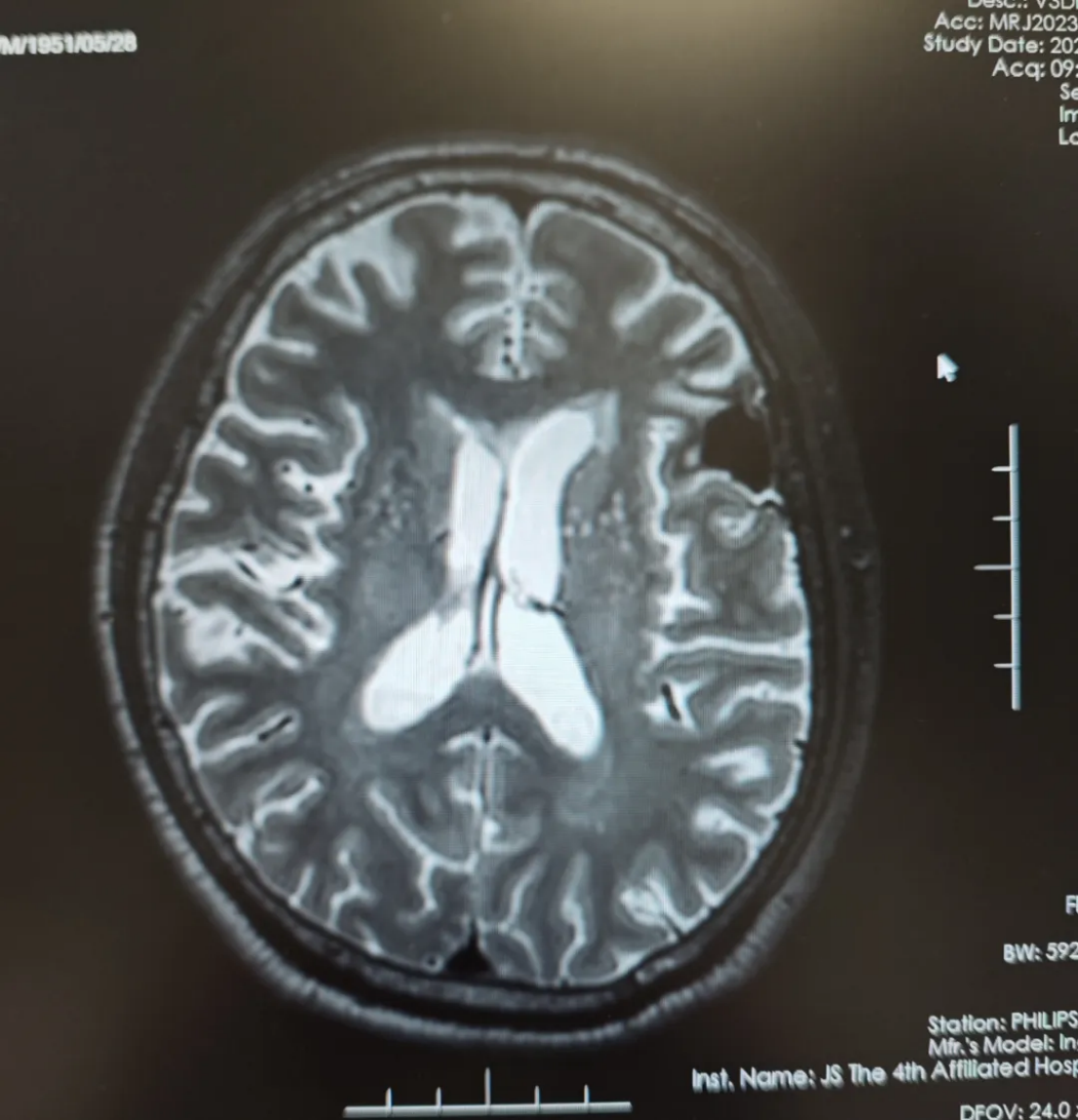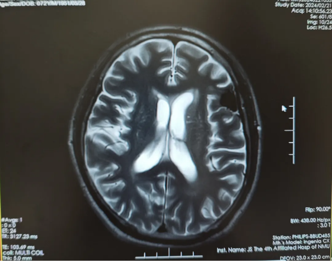 2024-02-21第一次随访,复查头颅磁共振平扫提示:左侧额叶转移瘤治疗后复查,局部软化灶形成,较前片(2023-12-15)相仿;两侧额叶及放射冠区少许缺血灶;老年性脑改变(图4)。