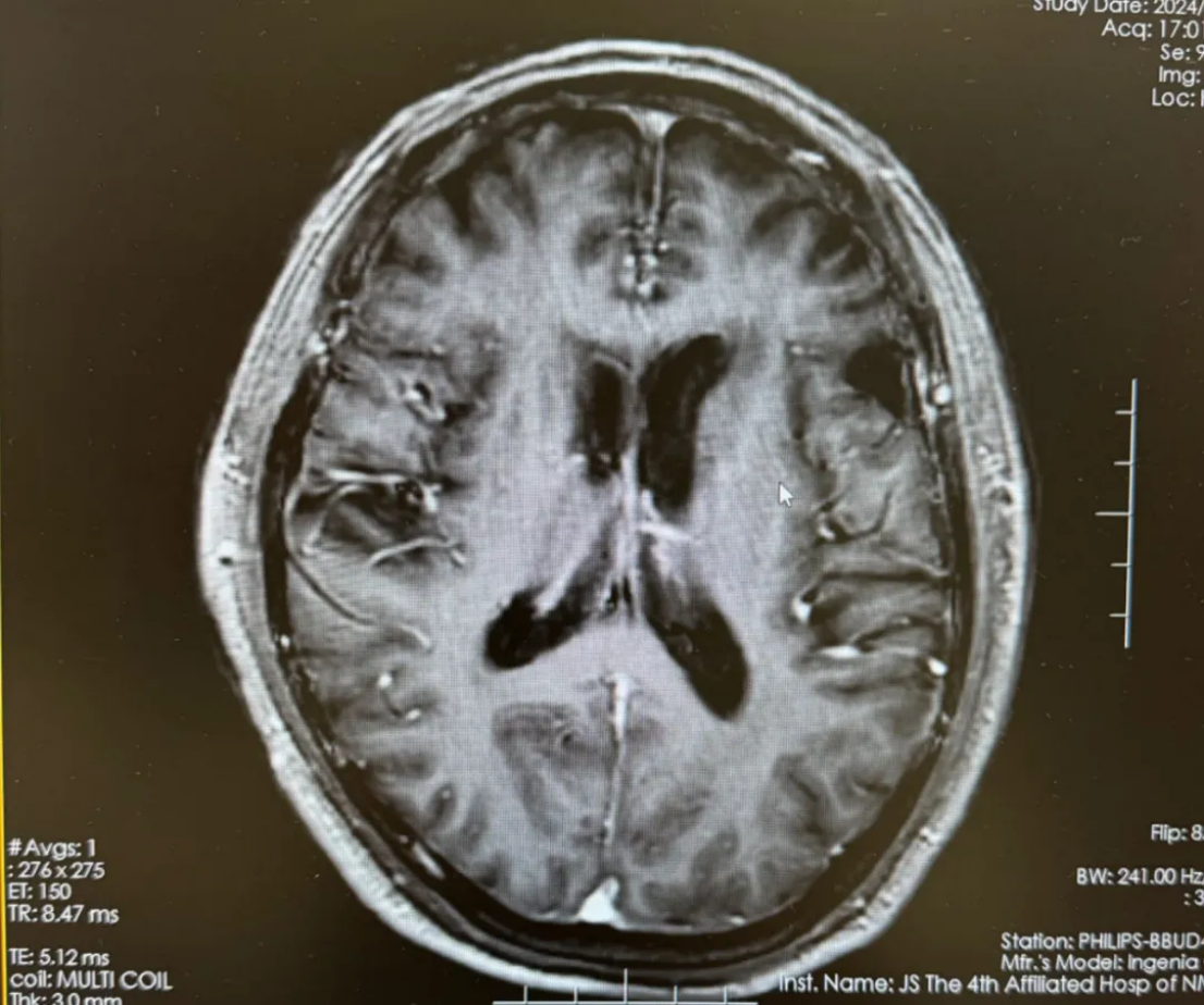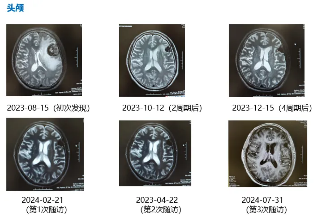 2024-07-31第三次随访,颅脑MRI平扫+增强提示:左侧额叶转移瘤治疗后改变,较前片(2024-04-22)大致相仿;两侧额叶及放射冠区少许缺血灶;老年性脑改变(图6)。患者病情稳定,继续随访。