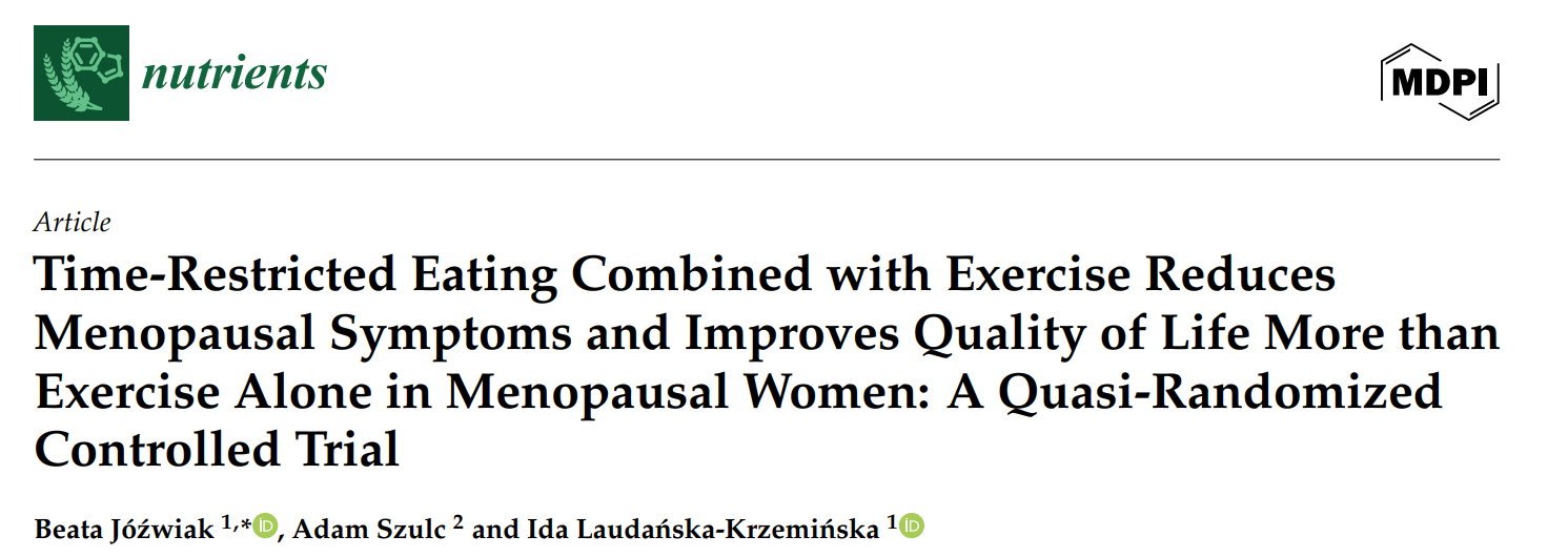 Jóźwiak, B.; Szulc, A.; Laudańska-Krzemińska, I. Time-Restricted Eating Combined with Exercise Reduces Menopausal Symptoms and Improves Quality of Life More than Exercise Alone in Menopausal Women: A Quasi-Randomized Controlled Trial. Nutrients 2025, 17, 3274. https://doi.org/10.3390/nu17203274