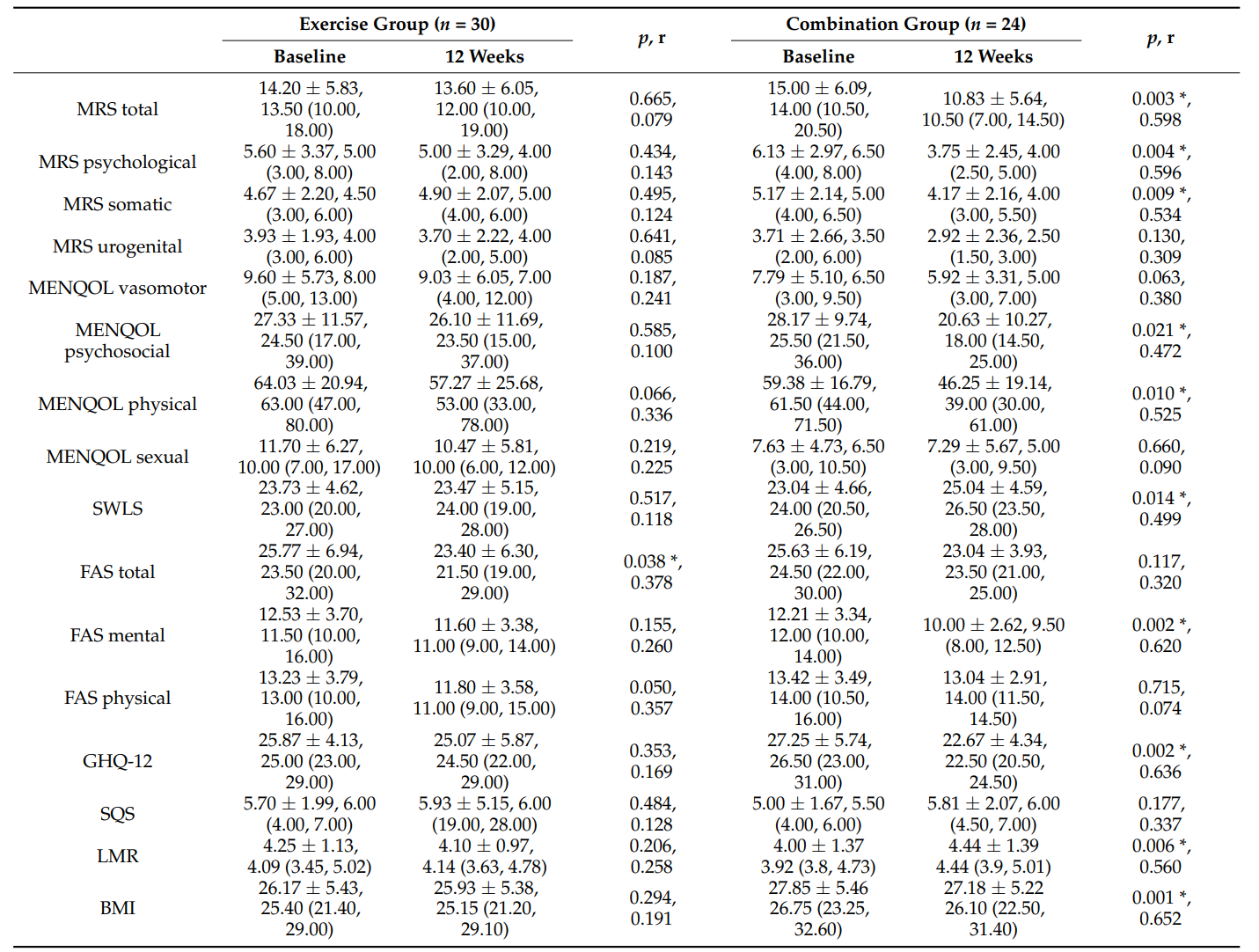 组合组生活满意度(SWLS)显著提高,心理健康(GHQ-12)和精神疲劳(FAS精神)显著改善,运动组无类似变化。两组均未见尿生殖系统症状和性功能相关指标显著改善,可能因缺乏针对性骨盆底肌锻炼及干预周期较短。