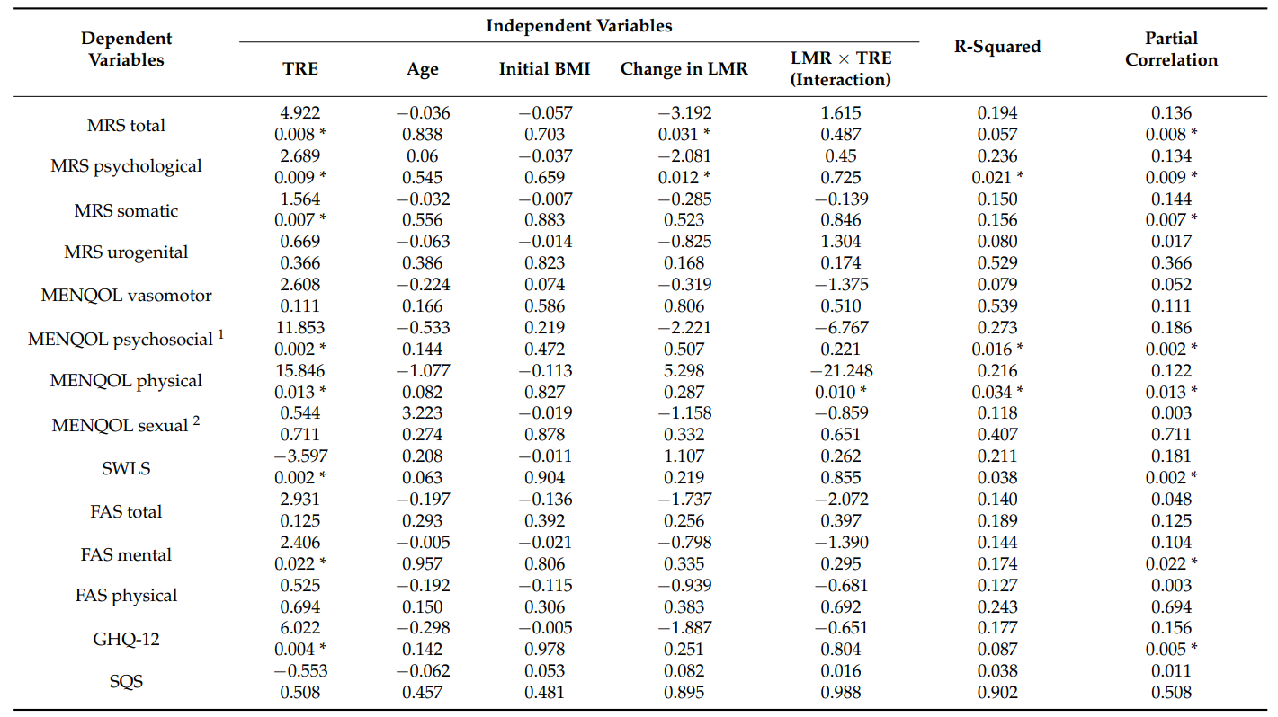 结果显示,组合组在MRS总分及心理、体征亚维度均显著下降,改善幅度大于运动组(P均<0.01),提示症状缓解更明显。MENQOL生活质量问卷显示,组合组的心理社会和身体亚维度评分显著下降,生活质量提升优于运动组(P<0.05)。 LMR的变化与MRS总分及心理亚维度呈正相关,提示炎症水平升高可能加重症状,而TRE似乎能缓冲这一影响。