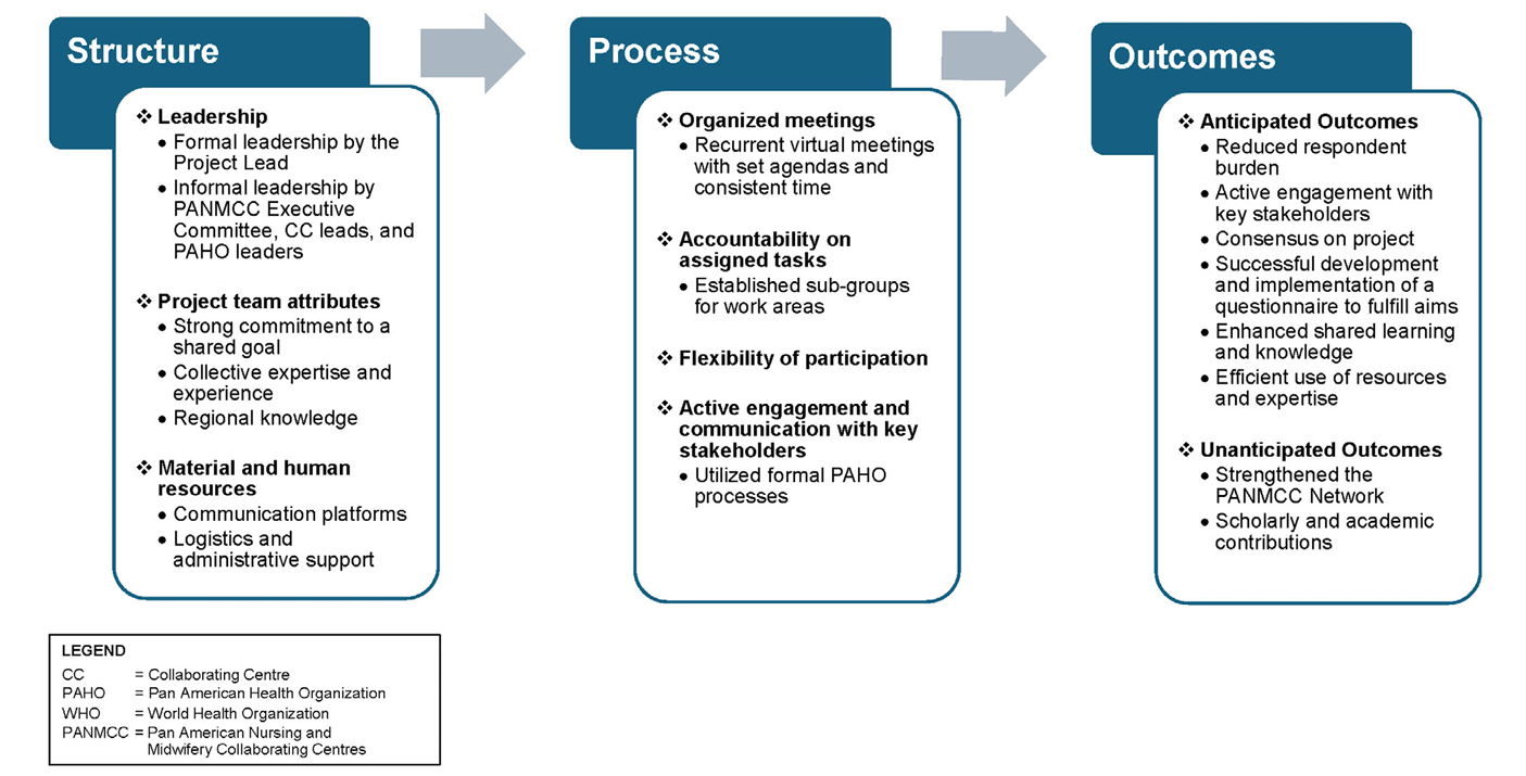 为了应对上述挑战,七所泛美卫生组织与世界卫生组织合作中心共同发起了一项多中心协作倡议,旨在通过协同努力,系统收集加勒比地区护理与助产人力资源的全域数据,降低重复调查带来的负担,并为区域人力资源策略提供实证支持。该倡议在实施过程中并未预先设定理论模型,但在总结阶段采用了Donabedian提出的“结构—过程—结果”框架作为分析工具,用以系统梳理合作中的关键要素。在结构层面,合作建立在正式与非正式领导力相结合的基础上,项目负责人统筹协调,合作中心领导、泛美卫生组织顾问及PANMCC网络执行委员会共同参与决策。团队成员表现出对共同目标的高度承诺,拥有包括国际协作、全球卫生护理、高级实践护理及助产教育在内的多元化专业背景,尤其是加勒比本地合作中心对区域教育体系、劳动力现状及关键利益相关方具有深刻理解。资源支持方面,项目充分利用了Zoom、Google Docs和BOX等在线平台进行沟通与文件管理,并由一名组管理员负责问卷内容的整合、数据维护与应答率监测,确保了项目推进的技术基础和后勤保障。