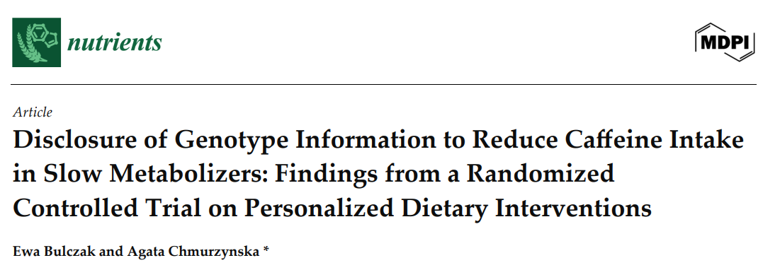 Bulczak, E.; Chmurzynska, A. Disclosure of Genotype Information to Reduce Caffeine Intake in Slow Metabolizers: Findings from a Randomized Controlled Trial on Personalized Dietary Interventions. Nutrients 2025, 17, 3236. https://doi.org/10.3390/nu17203236