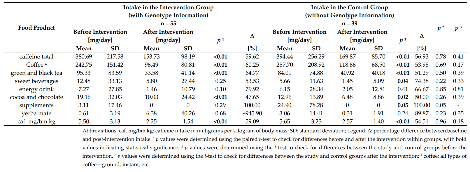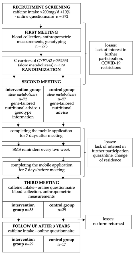 研究人员于2019至2021年在波兰波兹南生命科学大学进行,纳入94名年龄18至60岁、每日咖啡因摄入≥200毫克且为rs762551 CYP1A2基因C等位基因携带者的参与者(女性占63%)。参与者随机分为干预组(个性化营养指导加基因信息披露,n=55)与对照组(仅个性化营养指导,无基因信息,n=39)。所有参与者均接受限制咖啡因摄入至每日100毫克以下的建议。咖啡因摄入通过食物频率问卷(FFQ)和智能手机应用进行评估,后者基于生态瞬时评估(EMA)方法,实时提醒参与者记录摄入。干预持续20周,三年后进行随访调查评估长期效果。