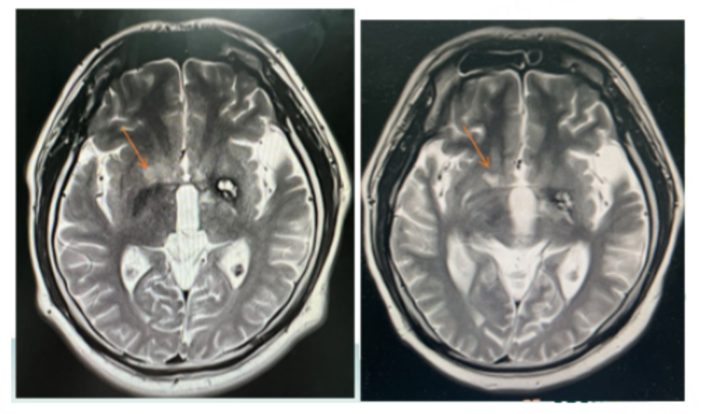 放化疗后复发:化疗结束后6个月首次复发,头颅MR提示新发右侧基底节区信号异常。放疗(全脑放疗36Gy及局部病灶放疗46Gy)结束10个月后二次复发,出现头晕,头颅MR提示新增双侧基底节区异常强化信号。