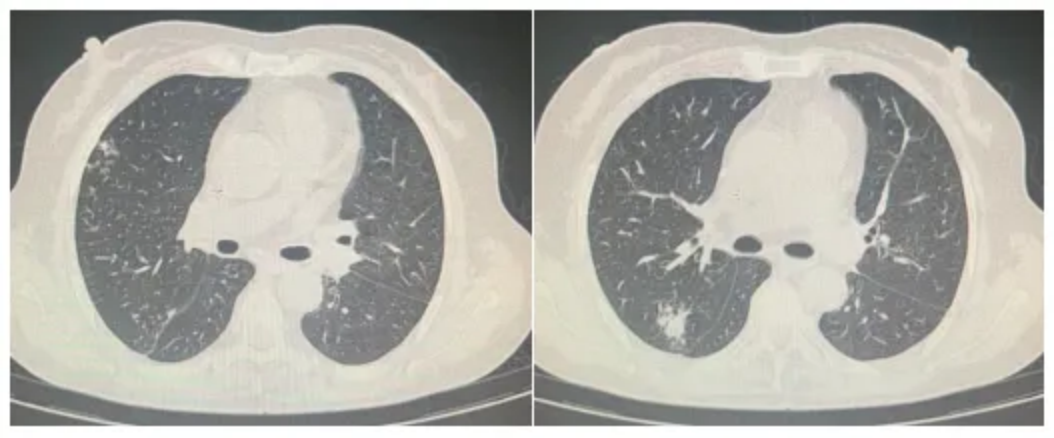 病情评估:新冠病毒感染重症肺炎,出现呼吸衰竭,治疗3周后残留肺间质纤维化,停药1个月后,患者疾病仍稳定,继续予以第4疗程化疗(图3)。