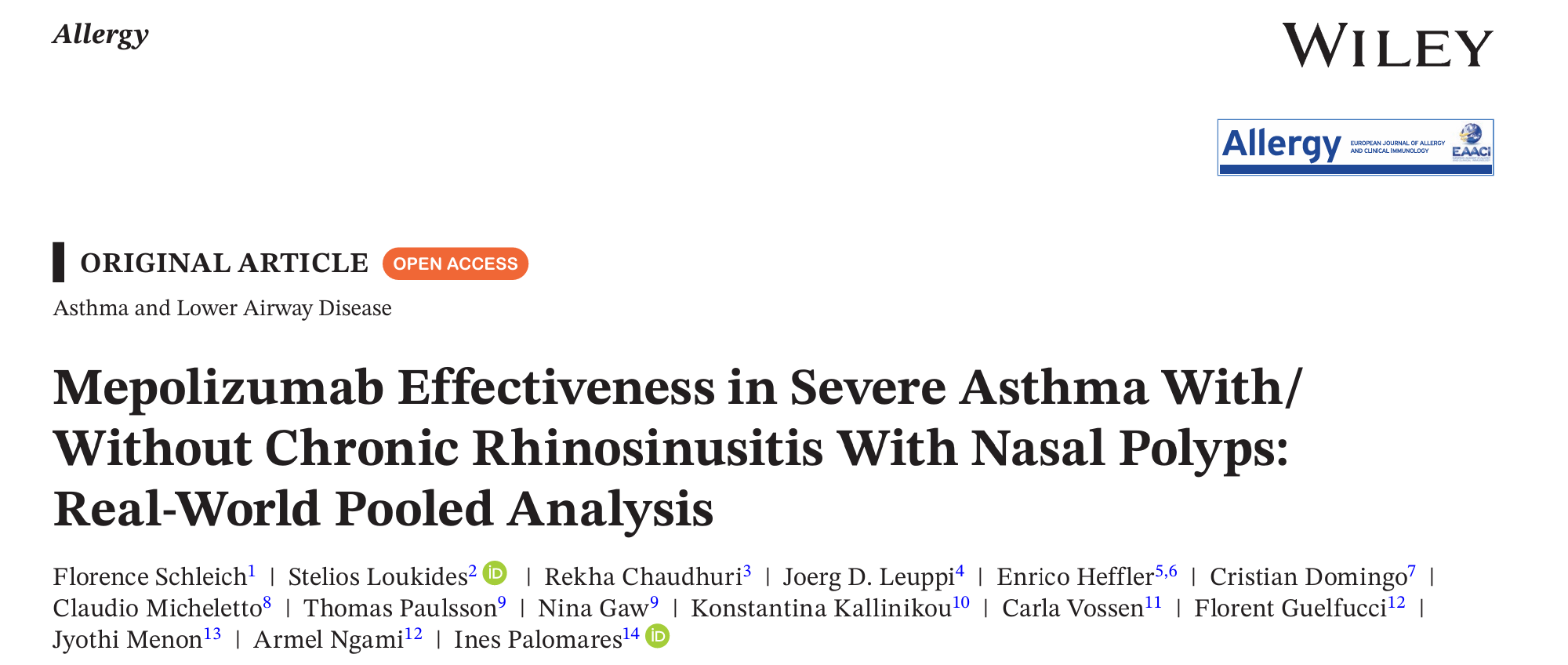 Schleich, F., Loukides, S., Chaudhuri, R., Leuppi, J. D., Heffler, E., Domingo, C., Micheletto, C., Paulsson, T., Gaw, N., Kallinikou, K., Vossen, C., Guelfucci, F., Menon, J., Ngami, A., & Palomares, I. (2025). Mepolizumab Effectiveness in Severe Asthma With/ Without Chronic Rhinosinusitis With Nasal Polyps: Real-World Pooled Analysis. Allergy, 80, 2557–2571. https://doi.org/10.1111/all.16618