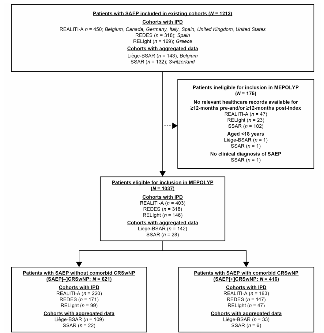 本研究采用观察性、多国、回顾性汇总分析设计,汇集了五个已发表队列的数据,这些队列主要来自欧洲国家,包括比利时严重哮喘登记列日分支、瑞士严重哮喘登记、真实世界美泊利单抗在患者护理中的有效性哮喘研究、美泊利单抗真实世界有效性与安全性研究以及希腊严重嗜酸性粒细胞哮喘两年真实生活研究。研究纳入了1037名成年患者,所有患者在指标日期时年龄均大于等于18岁,经临床诊断为严重嗜酸性粒细胞表型哮喘,并接受了美泊利单抗治疗,同时提供了知情同意,且拥有至少12个月治疗前和治疗后的相关医疗记录。患者根据是否合并慢性鼻窦炎伴鼻息肉分为两组,即无非合并症组和合并症组。