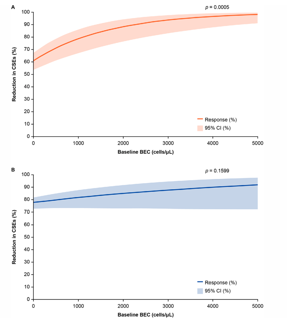 图2 按基线外周血嗜酸性粒细胞计数分层的(A)无非慢性鼻窦炎伴鼻息肉严重哮喘和(B)合并慢性鼻窦炎伴鼻息肉严重哮喘患者临床显著加重率变化
