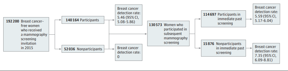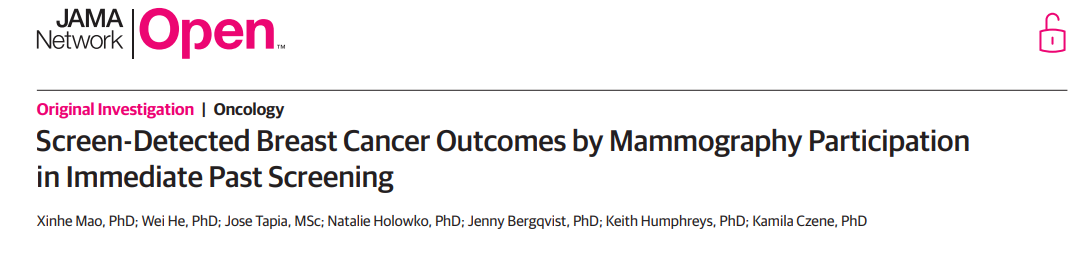 Mao X, He W, Tapia J, Holowko N, Bergqvist J, Humphreys K, Czene K. Screen-Detected Breast Cancer Outcomes by Mammography Participation in Immediate Past Screening. JAMA Netw Open. 2025 Oct 1;8(10):e2535330. doi: 10.1001/jamanetworkopen.2025.35330. PMID: 41042510; PMCID: PMC12495498.