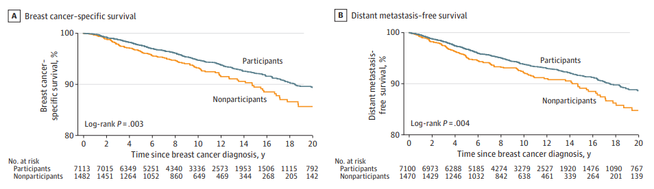 在生存分析方面,20年乳腺癌特异性生存率,非参与者为85.7%(95%CI 82.2%-88.6%),低于参与者89.4%(95%CI 88.1%-90.6%)。调整年龄及基线变量后,非参与者乳腺癌死亡风险升高(调整风险比1.33,95%CI 1.08-1.65);进一步调整肿瘤特征后差异减弱(HR 1.11,95%CI 0.89-1.38),提示肿瘤进展是生存差异的重要原因。