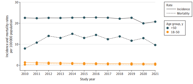 图:NSCLC患者按年龄分层的年度发病率与死亡率