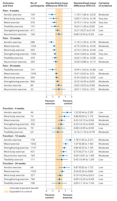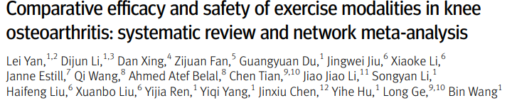Yan L, Li D, Xing D, et al. Comparative efficacy and safety of exercise modalities in knee osteoarthritis: systematic review and network meta-analysis. BMJ. 2025;391:e085242. Published 2025 Oct 15. doi:10.1136/bmj-2025-085242