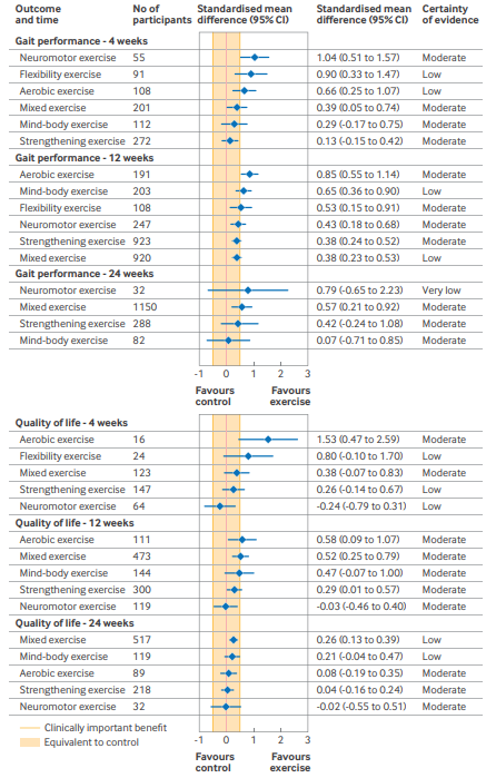 图:不同运动模式相对于对照组在步态表现和生活质量上的网络荟萃分析结果