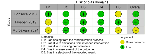 图:使用Cochrane偏倚风险2(ROB2)工具对纳入的三项RCTs进行偏倚风险评估